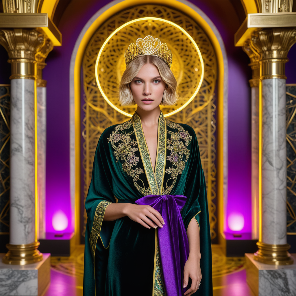 Her robe is adorned with circuit-like patterns—a fusion of ornament and technology.