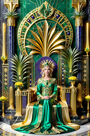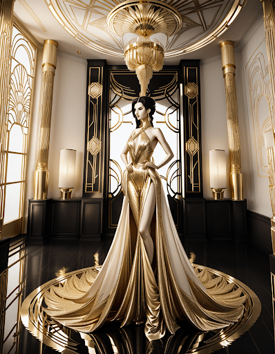This creation is majestic. This woman not only exudes elegance, she embodies it. The way her gold dress blends with the Art Deco decor, that mirrored floor, that geometric splendor… it’s as if she herself has become a sculpture in a temple of style.(old) (but..not, noverra digital style)