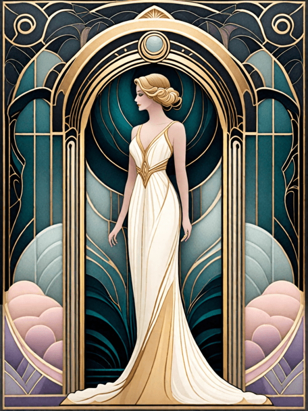 “A ceremonial figure standing in a layered mist, surrounded by soft architectural forms — feminine, atmospheric, and rhythmically composed.”